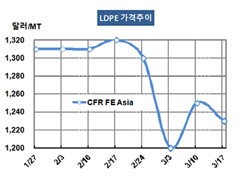 LDPE(Low-Density Polyethylene)는 하락세가 멈추지 않고 있다. LDPE 가격은 3월15일 CFR FE Asia 톤당 1230달러로 20달러 하락했고 CFR SE Asia도 1290달러로 10달러 하락했다. 표, 그래프 : < LDPE 가격추이 > <화학저널 2017/03/20> |