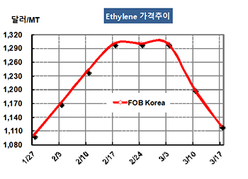 에틸렌(Ethylene)은 폭락세를 계속했다. 에틸렌 가격은 3월17일 FOB Korea 톤당 1120달러로 80달러 폭락했으나 CFR SE Asia는 1060달러로 40달러 급락하는데 그쳤다. CFR NE Asia는 65달러 폭락해 1155달러를 형성했다. 표, 그래프 : < Ethylene 가격추이 > <화학저널 2017/03/20> |