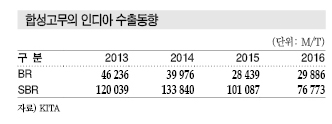 SBR 인디아 수출은 2013년 12만39톤에서 2014년 13만3840톤으로 소폭 증가했으나 2015년 10만1087톤, 2016년 7만6773톤으로 격감했다.