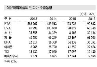 PTA 인디아 수출은 2013년 58만8962톤에 달했으나 2014년 43만9512톤, 2015년 19만2726톤, 2016년 9만882톤으로 급감했다.