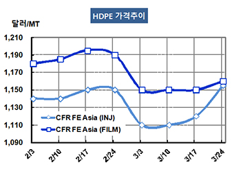 HDPE(High-Density Polyethylene)는 일부 그레이드만 폭등했다. HDPE 가격은 3월22일 Injection 그레이드가 CFR FE Asia 톤당 1155달러로 35달러 폭등했고 CFR SE Asia도 1165달러로 25달러 급등했다. 그러나 Film 그레이드는 FEA가 1160달러, SEA는 1180달러로 10달러 상승에 그쳤고, Yarn은 FEA가 1165달러, SEA는 1185달러로 5달러 상승에 머물렀다. 표, 그래프 : < HDPE 가격추이 > <화학저널 2017/03/27> |