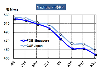 나프타(Naphtha)는 하락세를 지속하고 있다. 나프타 가격은 3월24일 CFR Japan 톤당 449달러로 14달러 하락했고 FOB Singapore 역시 439달러로 14달러 떨어졌다. 표, 그래프 : < Naphtha 가격추이 > <화학저널 2017/03/27> |