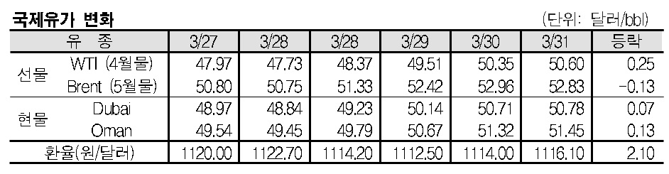 3월31일 국제유가는 나이지리아 송유관 폐쇄 등으로 상승했다. 3월31일 국제유가는 나이지리아 송유관 폐쇄 등으로 상승했다. 표, 그래프: <국제유가 변화> <화학저널 2017/04/03> |