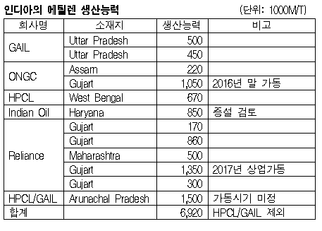 인디아가 석유화학 투자를 대폭 확대하고 있다. 표, 그래프: <인디아의 에틸렌 생산능력> <화학저널 2017/04/03> |