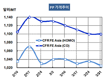 PP(Polypropylene)는 동북아시아만 하락했다. PP 가격은 3월29일 Raffia 및 Injection 그레이드가 CFR FE Asia 톤당 1025달러로 10달러 하락했으나 CFR SE Asia는 1080달러로 변동이 없었다. IPP Fim 및 BOPP도 FEA는 1045달러 및 1035달러로 10달러 하락했으나 SEA는 1100달러로 보합세를 형성했다. Block Copolymer는 FEA가 1100달러, SEA는 1155달러로 모두 변동이 없었다. 표, 그래프 : < PP 가격추이 > <화학저널 2017/04/04> |