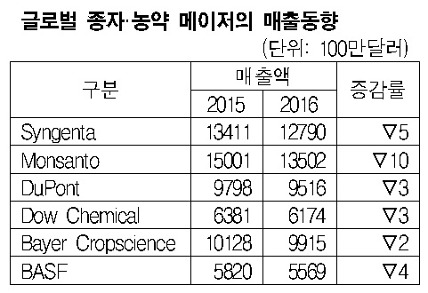 세계 종자‧농약 메이저들은 시황 침체를 벗어나기 위해 사업재편을 가속화하는 것이 요구되고 있다. 2016회계년도(2015년 9월-2016년 8월) 매출액이 135억200만달러로 전년대비 약 10% 줄었으며, 특히 농약 부문은 35억1400만달러로 26% 가량 급감한 것으로 나타났다. 표, 그래프: <글로벌 종자·농약 메이저의 매출동향> <화학저널 2017/04/04> |
