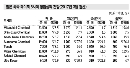 일본 석유화학기업들은 2016년에도 영업실적 호조를 지속한 것으로 파악된다. 표, 그래프 : <일본 화학 메이저 8사의 영업실적 전망(2017년 3월 결산)> <화학저널 2017년 4월 10일> |