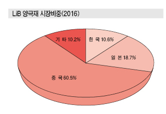 2016년 양극재 시장비중은 중국 60.5%, 일본 18.7%, 한국 10.6%, 기타 10.2% 수준으로 중국이 압도적인 것으로 파악되고 있다.