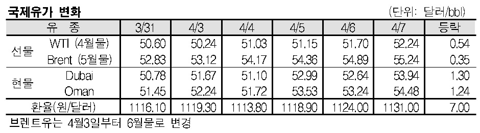 4월7일 국제유가는 중동지역 공급 차질 발생 가능성 증가 등으로 상승했다. 4월7일 국제유가는 중동지역 공급 차질 발생 가능성 증가 등으로 상승했다. 표, 그래프: <국제유가 변화> <화학저널 2017/04/10> |