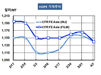 HDPE(High-Density Polyethylene)는 하락세가 뚜렷해지고 있다. HDPE 가격은 4월5일 Injection 그레이드가 CFR FE Asia 톤당 1140달러로 15달러 하락했고 CFR SE Asia도 1160달러로 15달러 떨어졌다. Blow-Molding은 FEA가 1100달러, SEA가 1120달러로 20달러 하락했고, Film 그레이드는 FEA가 1140달러로 25달러, SEA는 1160달러로 15달러 떨어졌다. 표, 그래프 : < HDPE 가격추이> <화학저널 2017/04/10> |