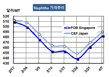 나프타(Naphtha)는 500달러에 육박했다. 나프타 가격은 4월7일 CFR Japan 톤당 490달러로 20달러 상승했고 FOB Singapore도 482달러로 21달러 올랐다. 표, 그래프 : < Naphtha 가격추이> <화학저널 2017/04/10> |
