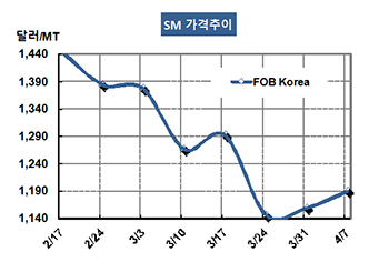 SM(Styrene Monomer)은 1200달러에 근접했다. SM 가격은 4월7일 FOB Korea 톤당 1189달러로 30달러 상승했고 CFR SE Asia 역시 1248달러로 29달러 올랐다. CFR India는 29달러 상승해 1243달러를 형성했다. 표, 그래프 : < SM 가격추이 > <화학저널 2017/04/12> |