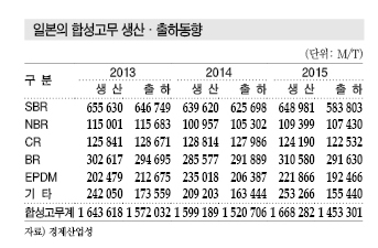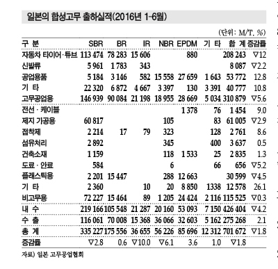 일본은 합성고무 수요가 내수와 수출의 비율이 대략 60대40 정도이며 내수는 절반 이상이 자동차 타이어용으로 투입되고 있다.