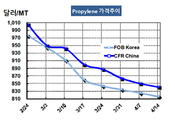 프로필렌(Propylene)은 800달러 붕괴가 가시화되고 있다. 프로필렌 가격은 4월14일 FOB Korea 톤당 816달러로 9달러 하락했고 CFR SE Asia는 805달러로 15달러 떨어졌다. 표, 그래프:<Propylene 가격추이> <화학저널 2017/04/18> |