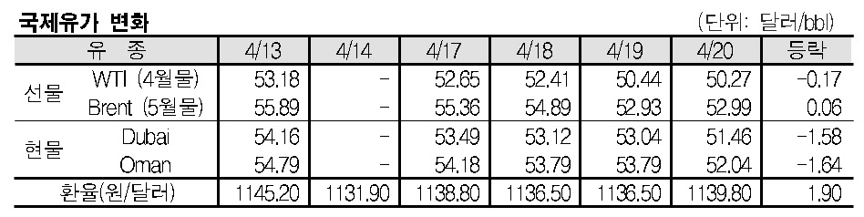4월20일 국제유가는 브렌트유(Brent)가 사우디와 쿠웨이트의 감산 연장지지 발언 등으로 상승했다. 4월20일 국제유가는 브렌트유가 사우디와 쿠웨이트의 감산 연장지지 발언 등으로 상승했다. 표, 그래프: <국제유가 변화> <화학저널 2017/04/21> |