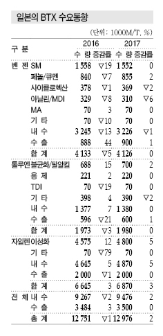 일본은 SM(Styrene Monomer) 가동중단 등으로 아로마틱(Aromatics) 수요가 줄어들고 있다. 표, 그래프:<일본의 BTX 수요동향> <화학저널 2017년 4월 24일> |