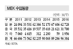 일본산 MEK 수입단가는 2014년 kg당 1416달러, 2015년 924달러, 2016년 732달러를 나타냈고 중국산은 2014년 1431달러, 2015년 935달러, 2016년 738달러를 형성했다.