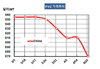 PVC(Polyvinyl Chloride)는 폭락세로 전환됐다. PVC 가격은 4월19일 CFR China 톤당 870달러로 40달러 폭락했고 CFR SE Asia도 880달러로 30달러 급락했다. CFR India는 930달러로 50딜러 폭락했다. 표, 그래프:<PVC 가격추이> <화학저널 2017/04/24> |