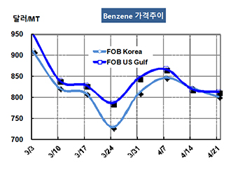 벤젠(Benzene)은 800달러대를 간신히 유지했다. 벤젠 가격은 4월21일 FOB Korea 톤당 802달러로 20달러 하락했고 FOB SE Asia 역시 803달러로 떨어졌다. CFR Taiwan은 800달러로 30달러 급락했다. 표, 그래프:<Benzene 가격추이> <화학저널 2017/04/26> |