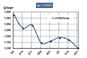 FOB Korea 1104달러로 67달러 떨어져 … 정기보수 후가 문제