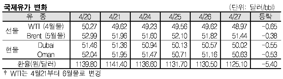 4월27일 국제유가는 산유국들 감산 연장 불확실성 및 리비아 원유 생산 재개, 미국 달러화 강세 등으로 하락했다. 4월27일 국제유가는 산유국 감산 연장 불확실성 및 리비아 원유 생산 재개 영향으로 하락했다. 표, 그래프: <국제유가 변화> <화학저널 2017/04/28> |