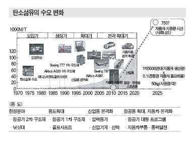 친환경 자동차는 1대당 탄소섬유 사용량이 50kg 수준이기 때문에 2025년 탄소섬유 수요가 75만톤에 달할 것으로 예측되고 있으며 기타 용도를 포함하면 더욱 급증할 것이 확실시되고 있다.