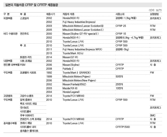 CFRP는 이방성, 내식성에 따른 독창성, 쾌적성, 신뢰성 등을 바탕으로 자동차 구조재용으로도 채용이 확대될 것으로 판단되고 있다.