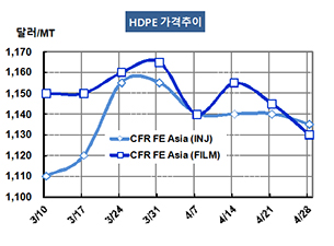 HDPE(High-Density Polyethylene)는 전체적으로 약세를 지속했다. HDPE 가격은 4월26일 Injection 그레이드 기준 CFR FE Asia 톤당 1135달러로 5달러 하락했고 CFR SE Asia도 1155달러로 5달러 떨어졌다. Blow-Molding은 FEA가 1110달러, SEA는 1130달러로 각각 10달러, Film은 FEA가 1130달러로 15달러, SEA는 1140달러로 10달러 하락했다. Yarn도 FEA는 1165달러, SEA는 1185달러로 각각 10달러 떨어졌다. 표, 그래프:<HDPE 가격추이> <화학저널 2017/05/02> |