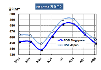 나프타(Naphtha)는 450달러가 무너질지 주목된다. 나프타 가격은 4월28일 CFR Japan 톤당 456달러로 14달러 하락했고 FOB Singapore도 450달러로 15달러 떨어졌다. 표, 그래프:<Naphtha 가격추이> <화학저널 2017/05/02> |