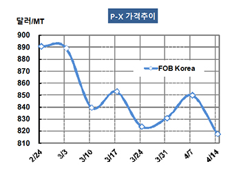 P-X(Para-Xylene)는 800달러가 무너졌다. P-X 가격은 4월28일 FOB Korea 톤당 796달러로 21달러 하락했고 CFR SE Asia도 810달러로 21달러 떨어졌다. CFR China는 21달러 하락해 816달러를 형성했다. 표, 그래프:<P-X 가격추이> <화학저널 2017/05/04> |