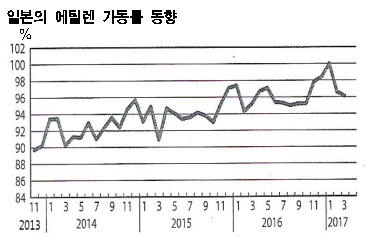 표, 그래프: <일본의 에틸렌 가동률 동향> <화학저널 2017/05/08> |