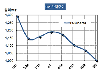 SM(Styrene Monomer)은 1000달러가 무너질 위기를 맞고 있다. SM 가격은 5월5일 FOB Korea 톤당 1002달러로 66달러 폭락했고 CFR SE Asia 역시 1061달러로 66달러 떨어졌다. CFR India는 70달러 폭락해 1040달러를 형성했다. 표, 그래프:<SM 가격추이> <화학저널 2017/05/10> |