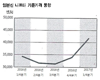 석유화학 시장은 장기간 이어진 호조가 2017년 하반기 종료될 것으로 예상된다. 표, 그래프: <일본산 나프타 기준가격 동향> <화학저널 2017/05/19> |