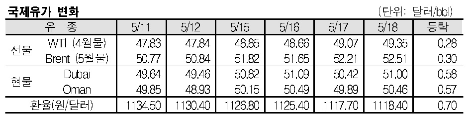 5월18일 국제유가는 러시아의 감산 연장 준수 의사 및 산유국 감산 연장 기대, 미국 달러화 약세 등으로 상승했다. 5월18일 국제유가는 러시아의 감산 연장 준수 의사 등으로 상승했다. 표, 그래프: <국제유가 변화> <화학저널 2017/05/19> |
