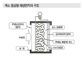 DSC는 TiO2(Titanium Dioxide) 나노 다공막, 루테늄(Ruthenium) 복합체 색소 및 요소 전해액을 활용하는 것이 표준 구조로 인공광합성 연구 성과를 바탕으로 개발했으며 스위스 Gratzem 연구진이 1991년 보고한 이후 화학 관련기업을 중심으로 실용화를 위한 연구개발이 활발히 이루어지고 있다.