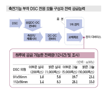 접속 태양전지 종류 및 밝기에 맞추어 자가 입력 임피던스를 최적으로 조정하는 기능 이외에 승압 타입은 0.3-0.5V 등 낮은 전압의 태양전지에서 효율적으로 전압을 변환해 축전하는 기능이 구비돼 있어 하나의 DSC 셀로도 전력을 효율적으로 이용할 수 있다.
