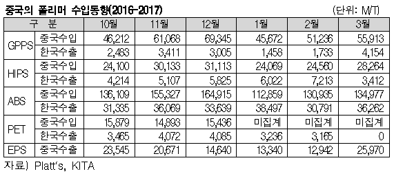 표, 그래프: <중국의 폴리머 수입동향(2016-2017)> <화학저널 2017/05/26> |