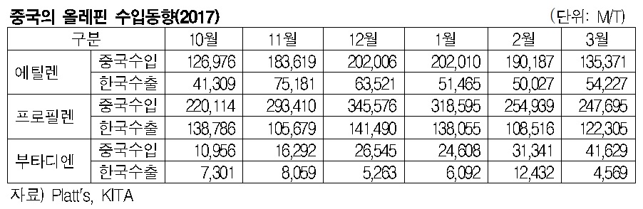 중국의 올레핀 수입동향(2017) <화학저널 2017/05/23> |