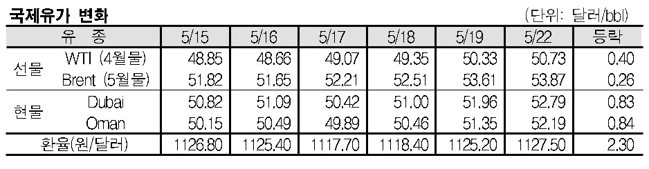 5월22일 국제유가는 이라크와 사우디의 감산 연장 합의 및 미국 달러화 약세 등으로 상승했다. 5월22일 국제유가는 이라크와 사우디의 감산 연장 합의 등으로 상승했다. 표, 그래프: <국제유가 변화> <화학저널 2017/05/23> |