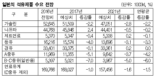 표, 그래프: <일본의 석유제품 수요 전망> <화학저널 2017/05/26> |