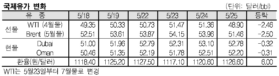 5월25일 국제유가는 OPEC(석유수출국기구) 정기총회 결과에 대한 시장의 실망감 등으로 폭락했다. 5월25일 국제유가는 OPEC 정기총회 결과에 대한 시장의 실망감 등으로 폭락했다. 표, 그래프: <국제유가 변화> <화학저널 2017/05/26> |