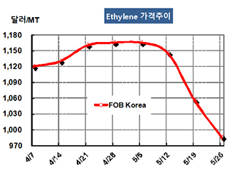 에틸렌(Ethylene)은 오랜만에 1000달러가 무너졌다. 에틸렌 가격은 5월26일 FOB Korea 톤당 985달러로 70달러 폭락했고 CFR SE Asia도 940달러로 60달러 떨어졌다. CFR NE Asia 역시 1030달러로 70달러 폭락했다. 표, 그래프: <Ethylene 가격추이> <화학저널 2017/05/29> |