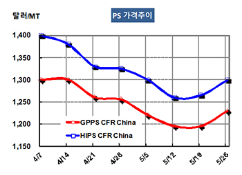 PS(Polystyrene)는 일시적으로 급등세를 나타냈다. GPPS(General Purpose PS) 가격은 5월24일 CFR China 톤당 1229달러로 34달러 급등했고 CFR SE Asia도 1239달러로 34달러 올랐다. 표, 그래프: <PS 가격추이> <화학저널 2017/05/31> |