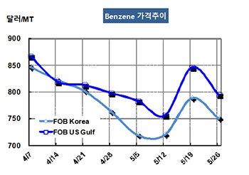 벤젠(Benzene)은 급락세로 전환됐다. 벤젠 가격은 5월26일 FOB Korea 톤당 751달러로 38달러 급락했고 FOB SE Asia도 746달러로 떨어졌다. CFR China 역시 766달러로 급락했다. 표, 그래프: <Benzene 가격추이> <화학저널 2017/05/31> |