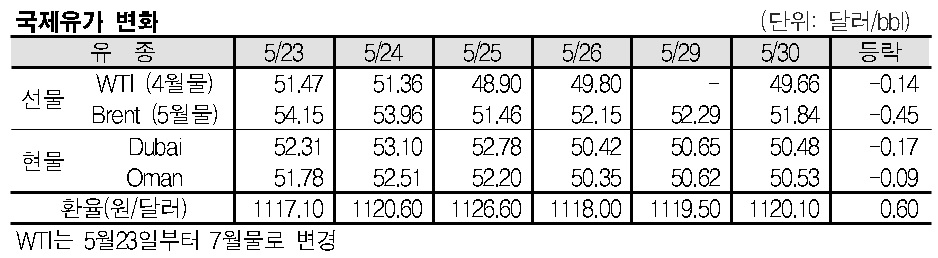 5월30일 국제유가는 리비아 생산 증가 가능성 및 공급과잉 우려 등으로 하락했다. 5월30일 국제유가는 리비아 생산 증가 가능성 등으로 하락했다. 표, 그래프: <국제유가 변화> <화학저널 2017/05/31> |