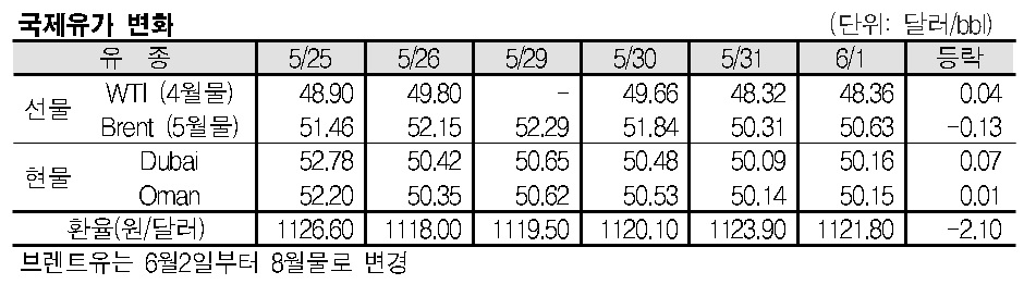 6월1일 국제유가는 브렌트유(Brent)와 WTI(서부텍사스 경질유) 가격이 상반된 양상을 나타냈다. 6월1일 브렌트유는 나이지리아‧리비아의 감산 참여 가능성 감소, 미국의 파리기후협약 탈퇴 선언, 미국 달러화 강세 등으로 하락했다. 표, 그래프: <국제유가 변화> <화학저널 2017/06/02> |