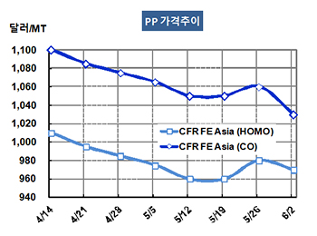 PP(Polypropylene)는 지역별로 등락이 엇갈렸다. PP 가격은 5월31일 Raffia 및 Injection 그레이드 기준 CFR FE Asia 톤당 970달러로 10달러 및 20달러 하락했으나 CFR SE Asia는 1040달러로 변동이 없었다. BOPP도 FEA는 980달러로 10달러 떨어졌으나 SEA는 1055달러로 보합세를 형성했다. 표, 그래프: <PP 가격추이> <화학저널 2017/06/05> |