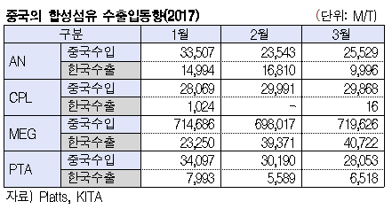 표, 그래프: <중국의 합성섬유 수출입동향(2017)> <화학저널 2017/06/08> |
