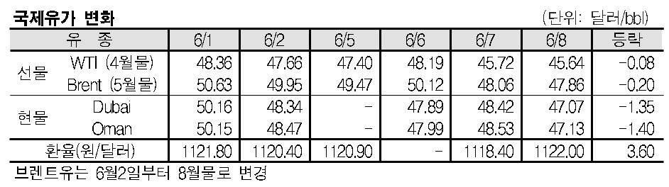 6월8일 국제유가는 미국 원유 재고 증가 여파 지속 및 나이지리아 수출재개, 미국 달러화 강세 등으로 하락했다. 6월8일 국제유가는 미국 원유 재고 증가 여파 지속 등으로 하락했다. 표, 그래프: <국제유가 변화> <화학저널 2017/06/09> |