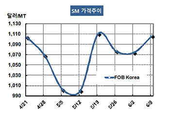 SM(Styrene Monomer)은 다시 1100달러를 넘어섰다. SM 가격은 6월9일 FOB Korea 톤당 1106달러로 32달러 상승했고 CFR SE Asia도 1163달러로 32달러 올랐다. CFR India 역시 32달러 올라 1136달러를 형성했다. 표, 그래프: <SM 가격추이> <화학저널 2017/06/14> |